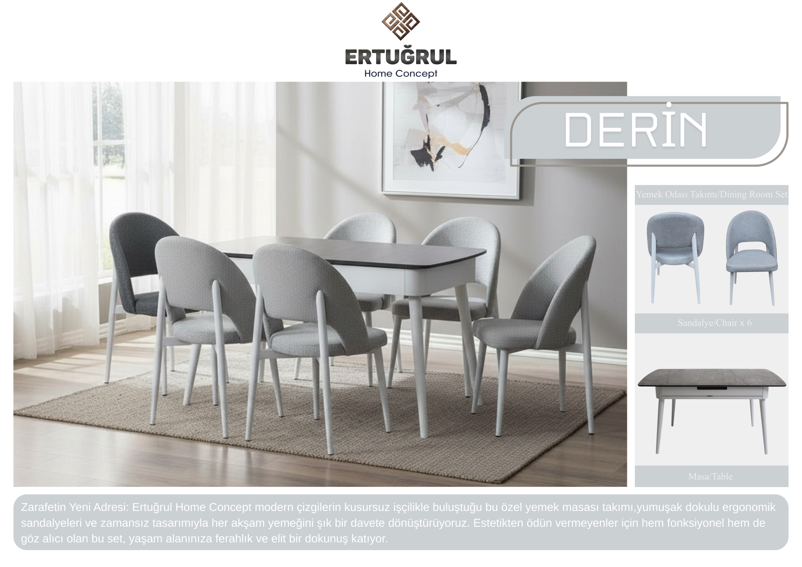 ERTUĞRUL HOME Eviniz için özel olarak üretilmiş kaliteli masa ve sandalyeler. HAKKIMIZDA ERTUĞRUL Masa Sandalye olarak, seçkin kalitede masa ve sandalyeler üretiyoruz. Katalogumuzu, iletişim bilgilerimizi ve adresimizi yardımlarımızla paylaşıyoruz. YEMEK TAKIMLARI Shop Now OTURMA GRUBLARI View All YATAK ODALARI Browse AKSESUARLAR(SEHPA,TV ÜNİTESİ VS.) See More TEL:05526022638